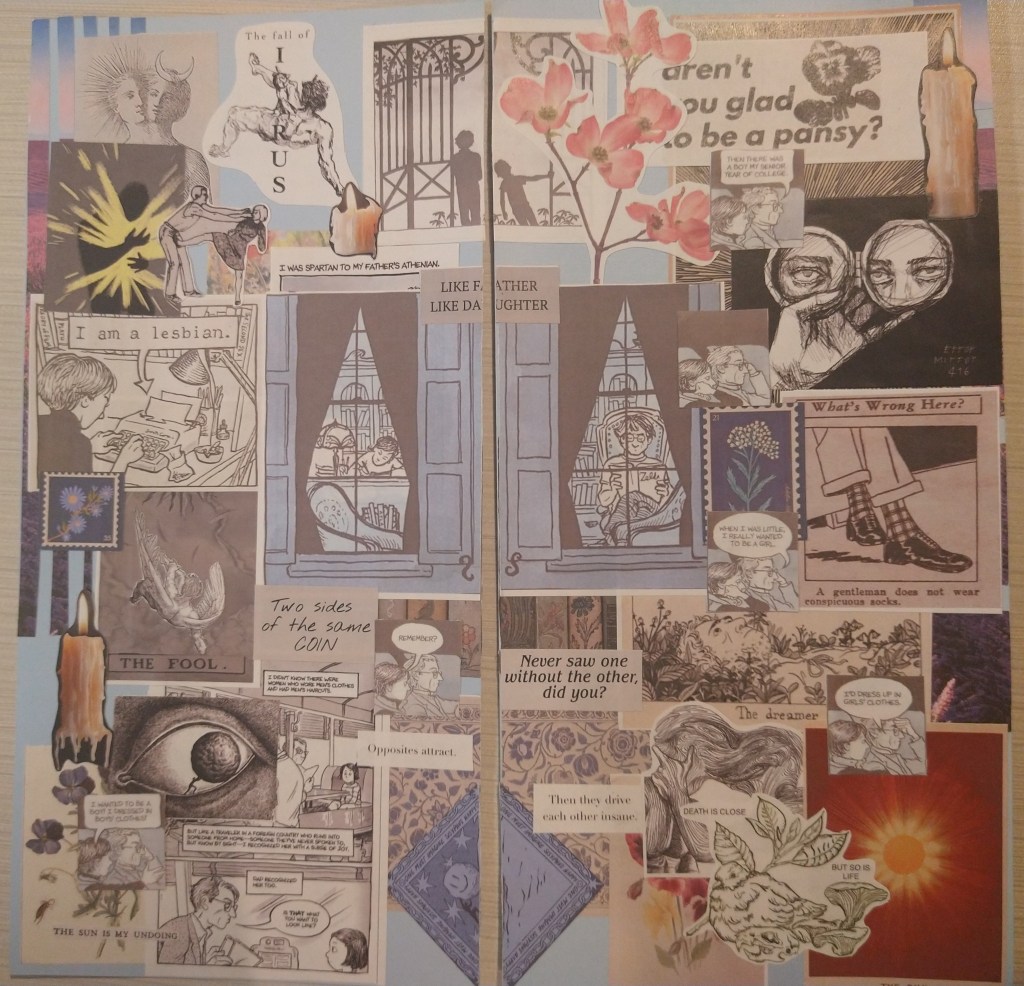 A project for an LGBTQ+ Literature course in college. It is a two-part collage on cardstock. It uses multiple pictures displayed in a specific manner, and when put together, displays a third picture in the center. It explores the dynamic relationship between Alison Bechdel and her father in Fun Home. It deals with the concepts of mirroring and the quote “two sides of the same coin”. The idea that they were such opposites in how they viewed gender and sexuality that they ended up being so similar in how they displayed both and weren’t so separate as they seem to be. Mirroring comes into play as it is a psychological display after watching another and copying their mannerisms, ideals, style, etc. This is often done subconsciously without much thought. This showcases my ability to do graphic design, but in a physical medium.